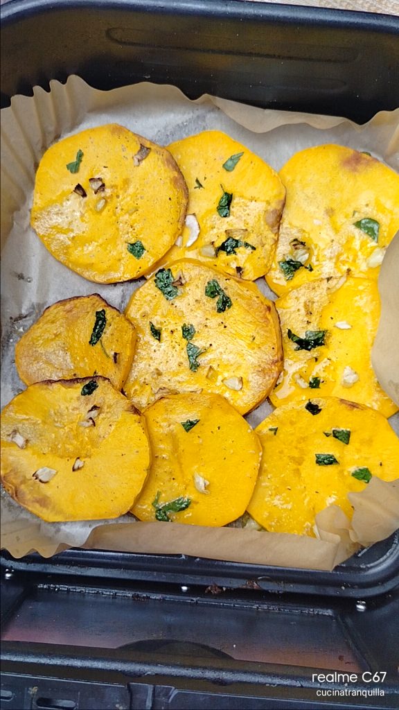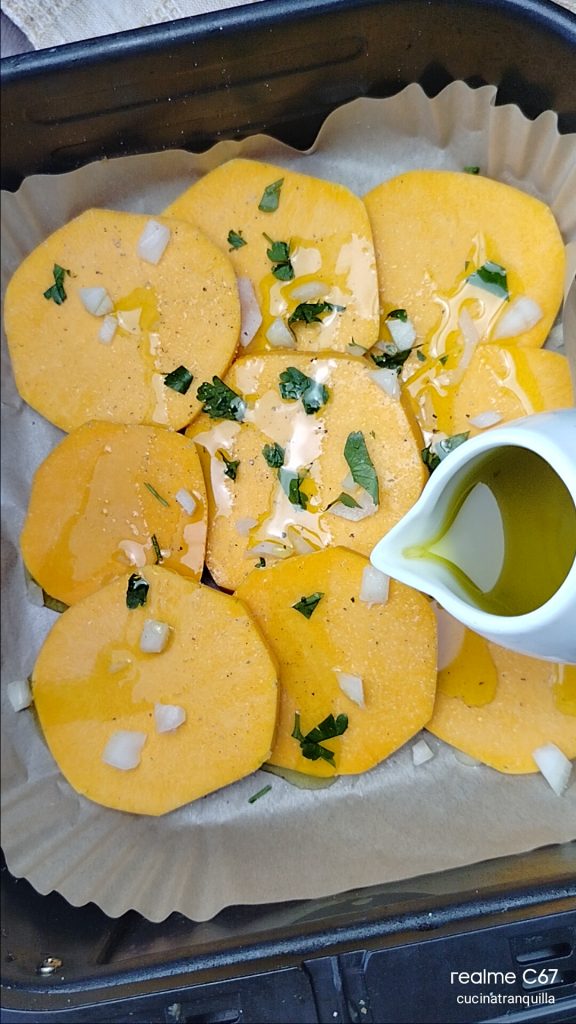 Legen Sie die Kürbisscheiben in den mit Backpapier ausgelegten Korb der Heißluftfritteuse.