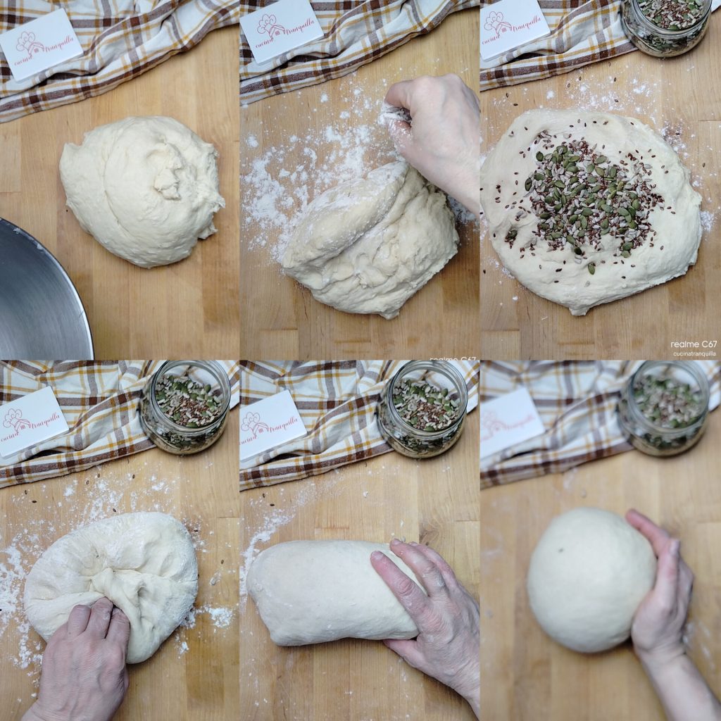 • Nach dieser Zeit nehmen Sie den Teig wieder auf, bestreuen die Arbeitsfläche ein wenig mit Mehl, dehnen ihn aus, fügen die Samen hinzu und arbeiten ihn wieder zu einer glatten und homogenen Kugel.