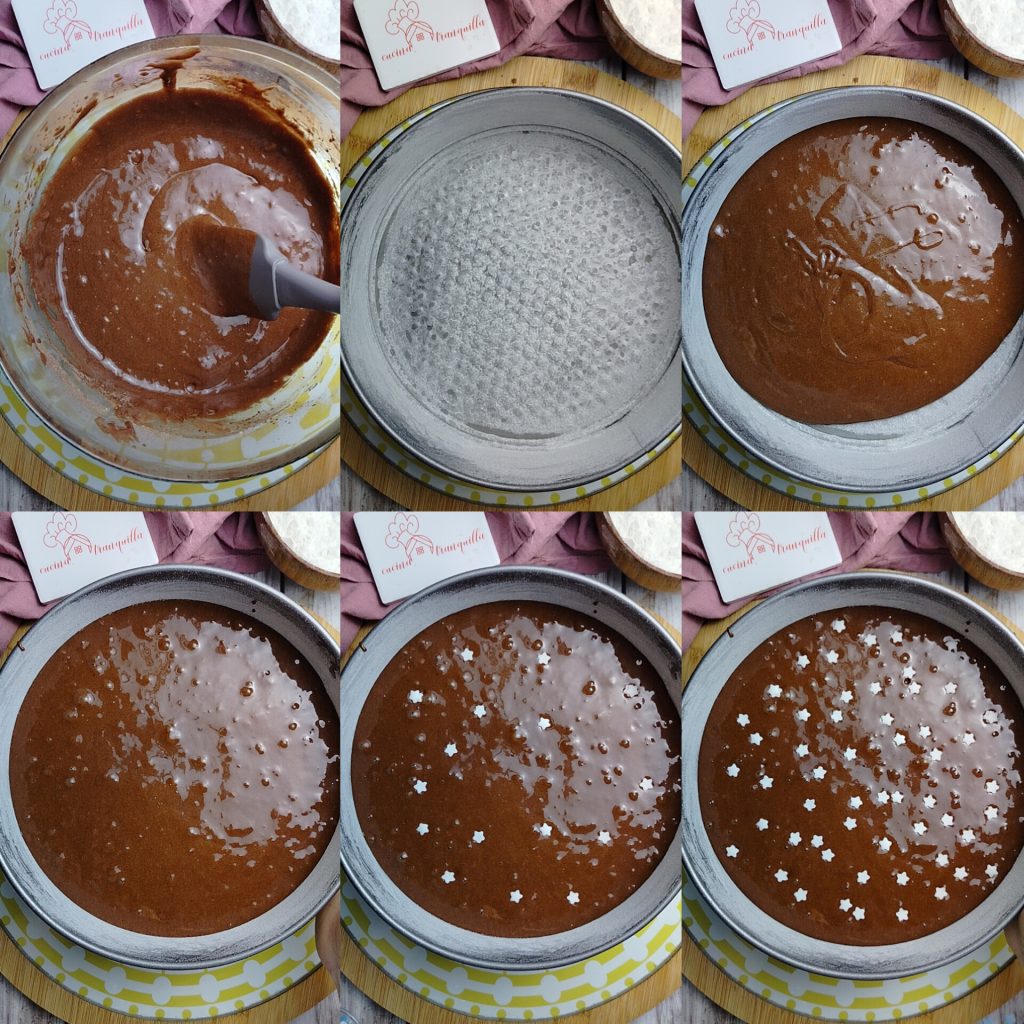 Mit einem Spatel den Teig vom Schüsselrand lösen und in eine leicht gefettete und bemehlte Springform (24 cm Ø) füllen. Oben mit den weißen Sternchen bestreuen. Im vorgeheizten Umluftofen bei 180 °C auf der mittleren Schiene 40 Minuten backen.