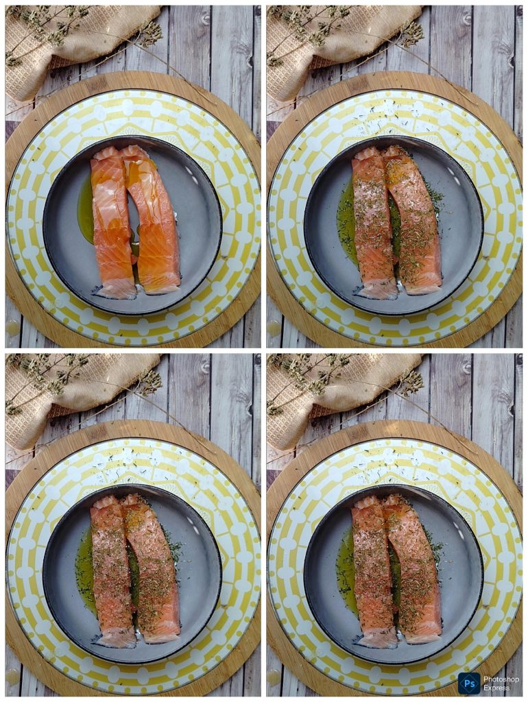 Um den marinierten Lachs in der Heißluftfritteuse zuzubereiten, legen wir das in zwei Hälften geteilte Lachsfilet in eine Schüssel und beträufeln es mit zwei Esslöffeln extra nativem Olivenöl.