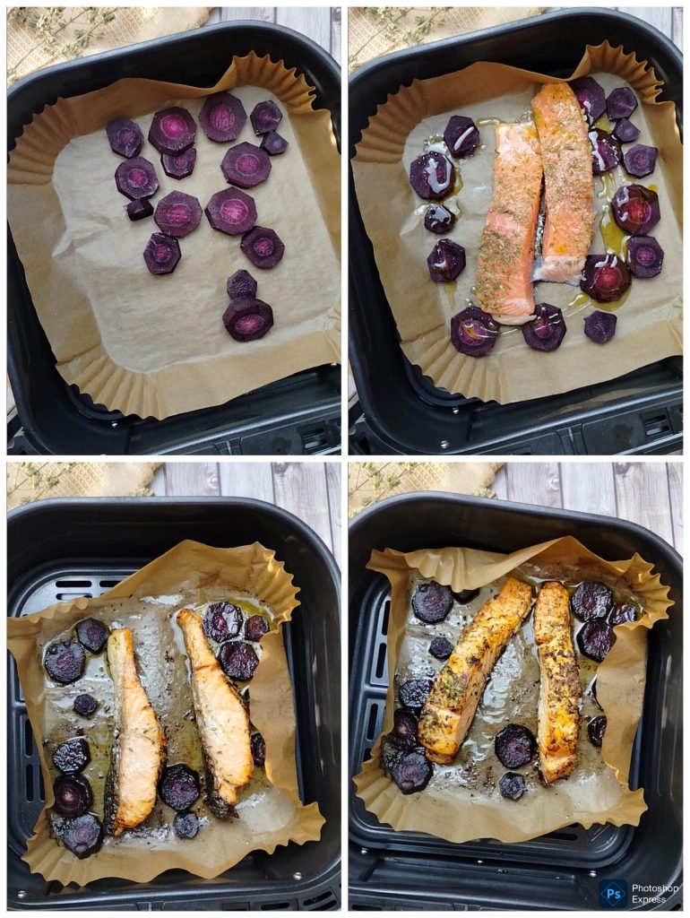 Lachs mariniert, gekocht in der Heißluftfritteuse mit violetten Karotten, ein superschnelles und einfaches Rezept.