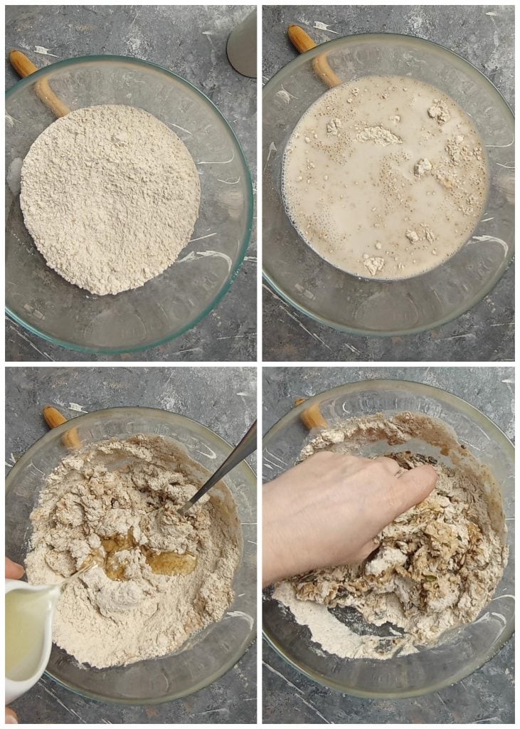 • Füge dann das aufgelöste Hefe-Gemisch mit allen Flüssigkeiten zum Mehl hinzu und mische es.