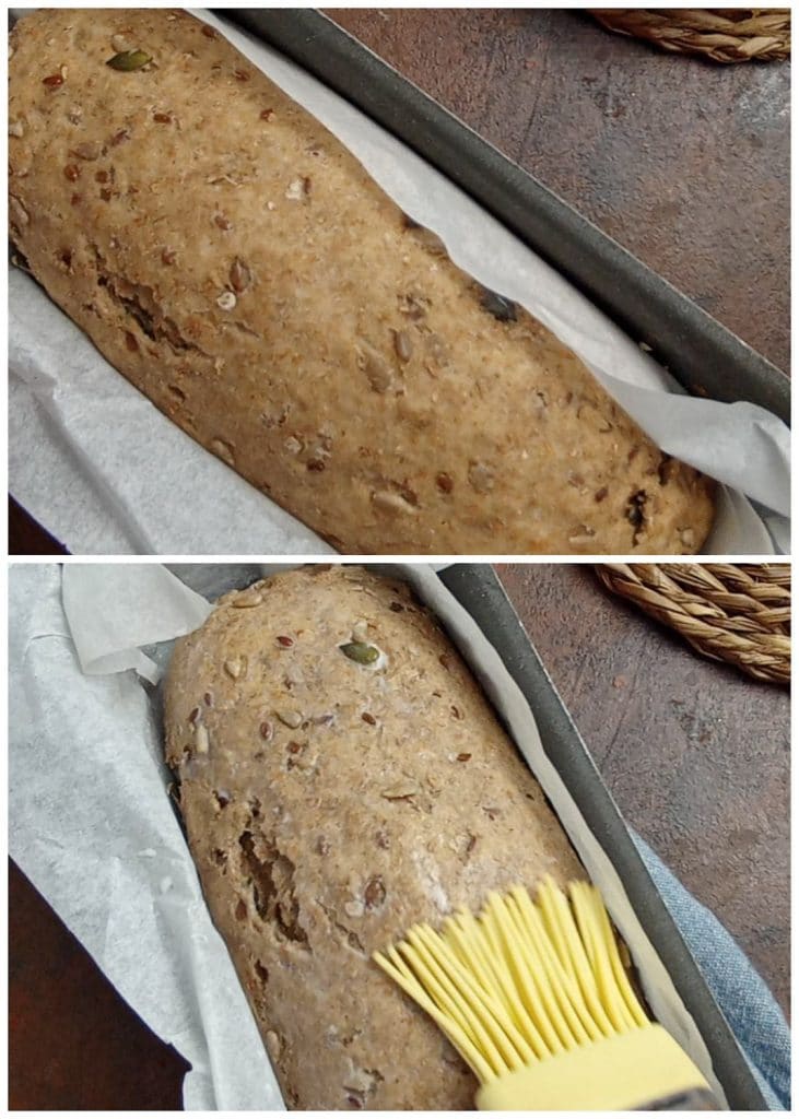 • Wenn das Mehrkornbrot fertig ist, nimm es aus dem Ofen und bestreiche es, solange es noch warm ist, mit etwas Milch.