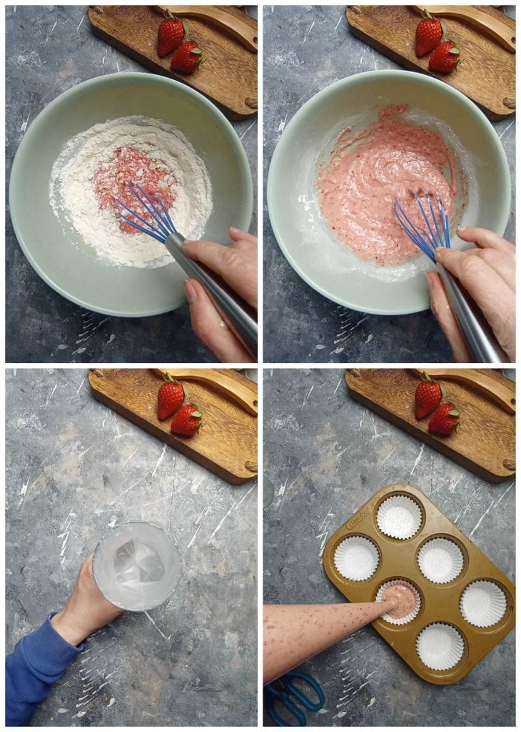 Wir geben die Mischung in einen Spritzbeutel, um ein gleichmäßigeres Endergebnis zu erzielen, und füllen die Förmchen zu zwei Dritteln.