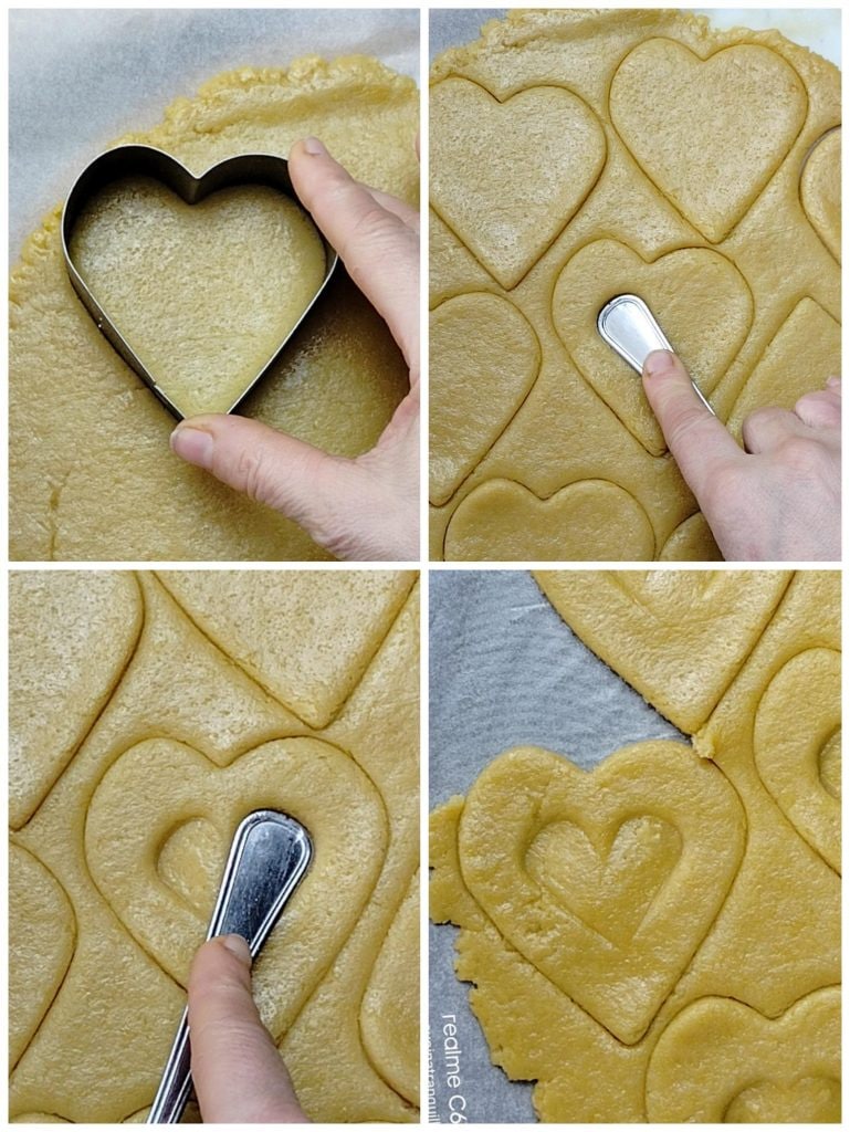 Schneiden Sie die Kekse mit einem herzförmigen Ausstecher aus und versuchen Sie, sie nicht zu klein zu machen.