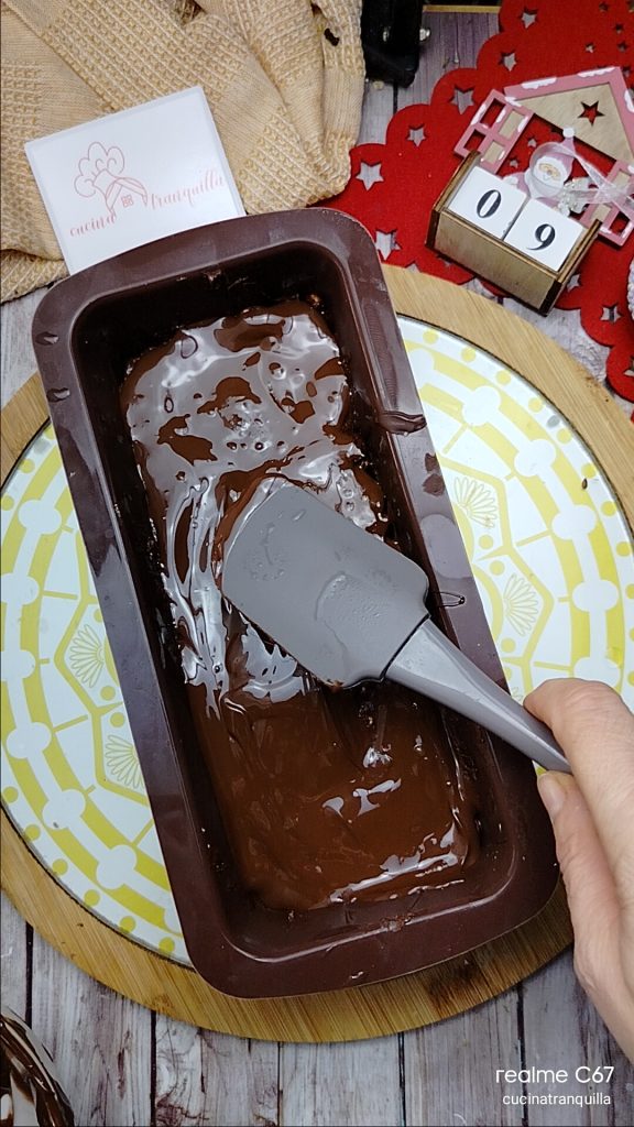 Nehmen Sie Ihre Form, die sauber und trocken sein sollte, und gießen Sie etwa 100 g dunkle Schokolade hinein.