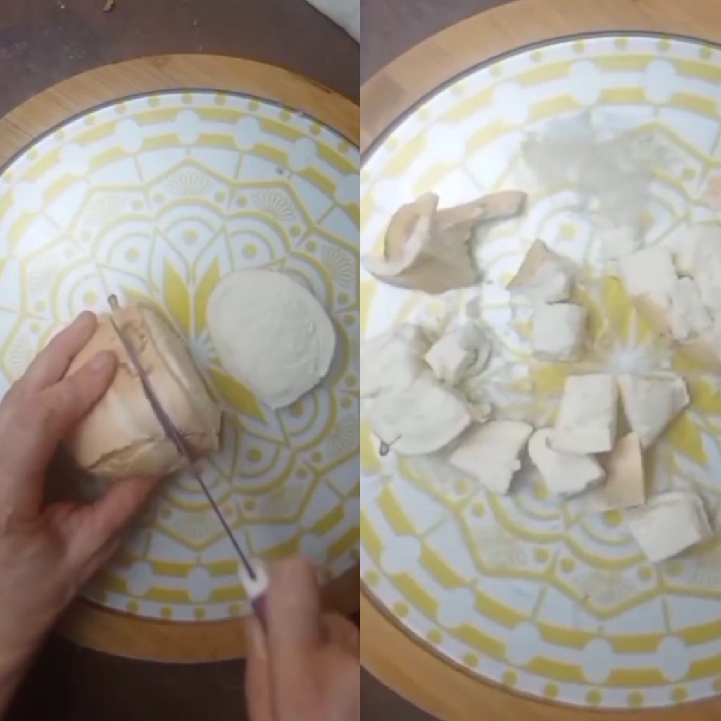 Schneiden Sie den Provola zuerst in Scheiben und dann in Würfel.
