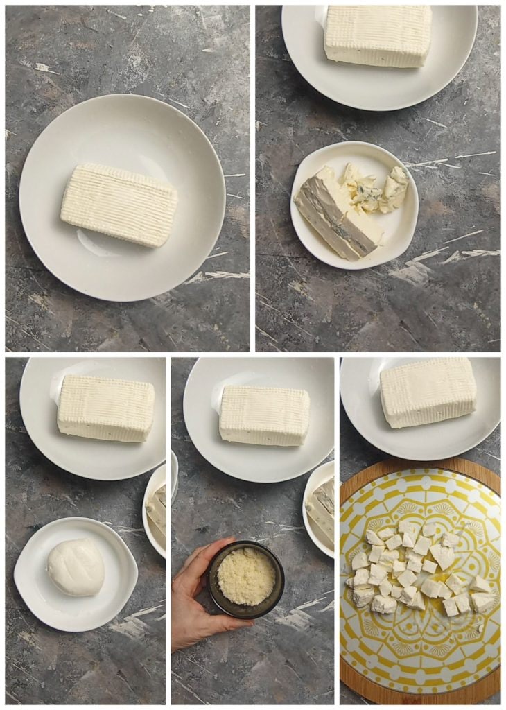 In der Zwischenzeit bereite die Käsesorten vor, die du für das Rezept benötigst.