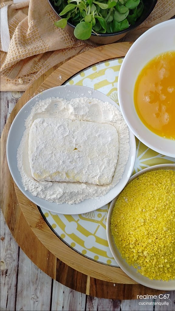 Jetzt tauchen Sie die Scheibe in das Mehl, wobei Sie auch auf die Ränder drücken, um den Käse gut zu versiegeln.