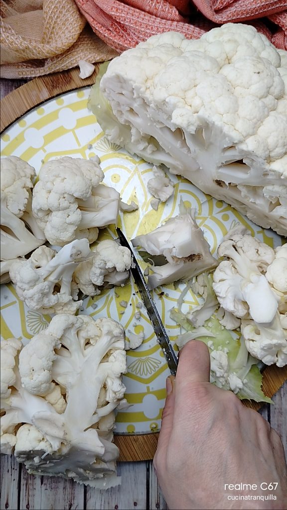 Für die Pasta mit Blumenkohl und Gorgonzola, reinigen Sie zuerst den Blumenkohl, indem Sie die Außenblätter und den Strunk entfernen.