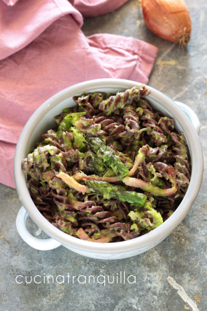Pasta Venere mit Spargel und Speck, ein einfaches und schmackhaftes erstes Gericht, das sich mit den ersten Spargeln der Saison zubereiten lässt – den großen, geschmackvollen Stangen. In diesem Rezept sorgt die gewählte Pasta, die Pasta Venere, für das gewisse Etwas, doch ihr könnt jede gewünschte Form verwenden. Die Zubereitung ist sehr leicht und ermöglicht es vor allem, den Großteil des Spargelstiels zu verwerten, hier in einer köstlichen Creme, die nur mit dem Kochwasser der Stiele hergestellt wird. Unten habe ich einige Rezepte zur Verwendung von Spargel eingefügt, und am Ende der vollständigen Schritt-für-Schritt-Beschreibung findet ihr auch Antworten auf die häufigsten Fragen.