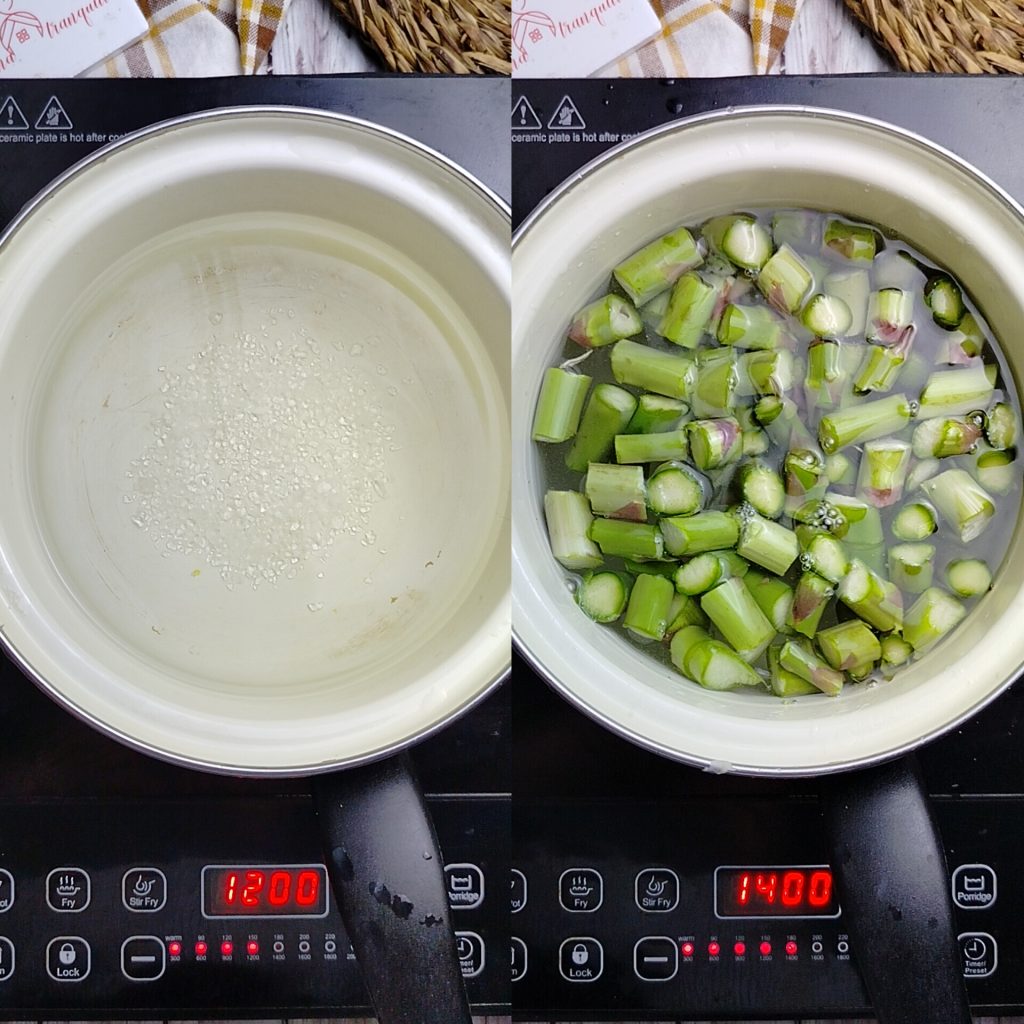 • Blanchiert den Spargel in leicht gesalzenem Wasser für 10 Minuten und gießt ihn ab, dabei behaltet ihr drei Kellen heißes Wasser zurück.
