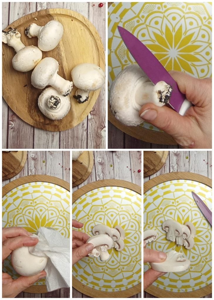 Um die Polenta mit frischen Pilzen zuzubereiten, reinigen Sie zuerst die Pilze, indem Sie den erdigen Stiel entfernen.