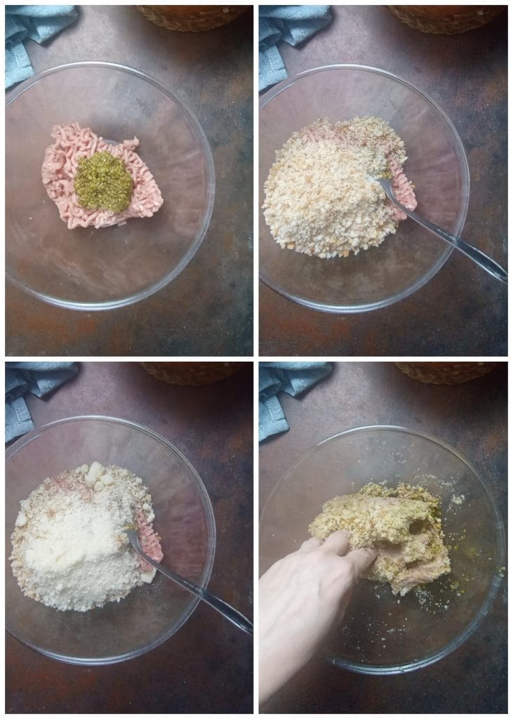 • Um die Putenklößchen mit Pesto zuzubereiten, gib das gemahlene Putenfleisch in eine Schüssel und arbeite es schnell mit den Händen.