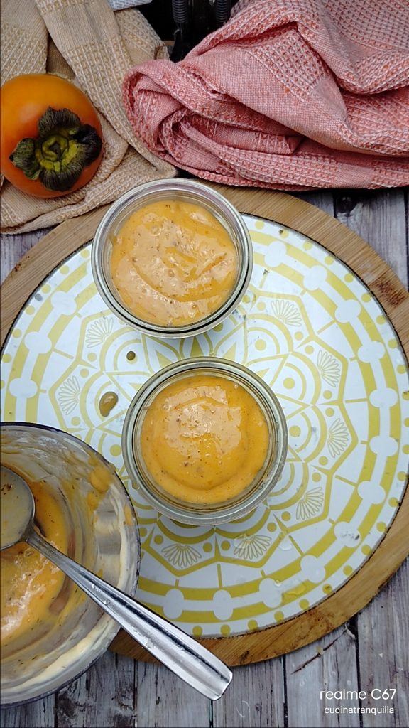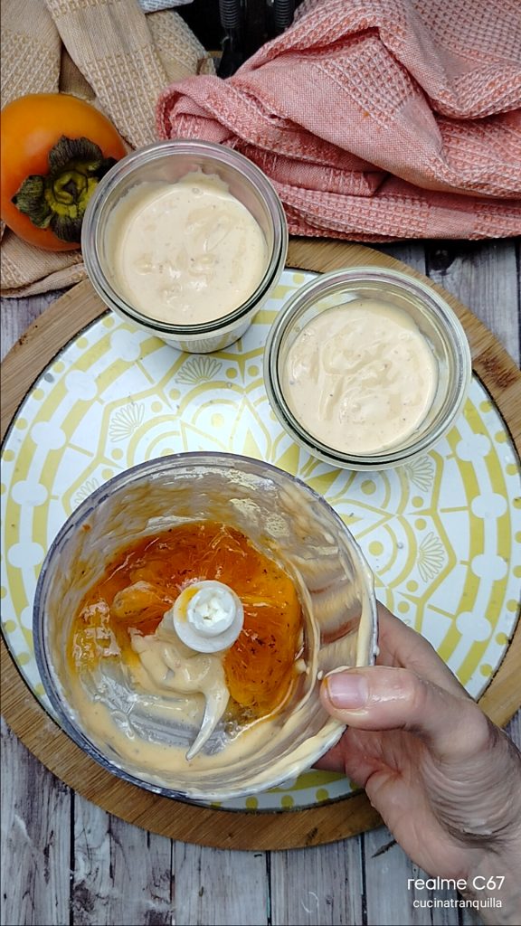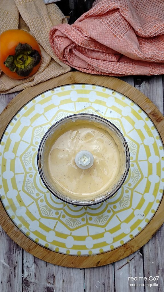 In diesem Rezept ist es wichtig, eine ziemlich weiche und cremige Zutat zu verwenden. Die Kaki Mela, die als Produkt härter ist, ist für die Verwendung in dieser Idee nicht besonders geeignet. Hier unten zeige ich Ihnen ihre Cremigkeit nach der Ruhezeit.