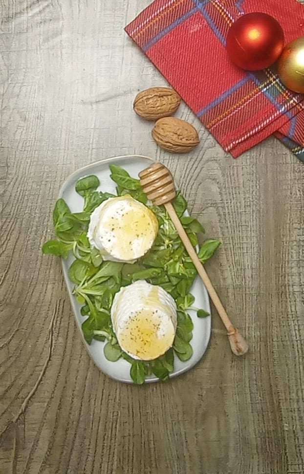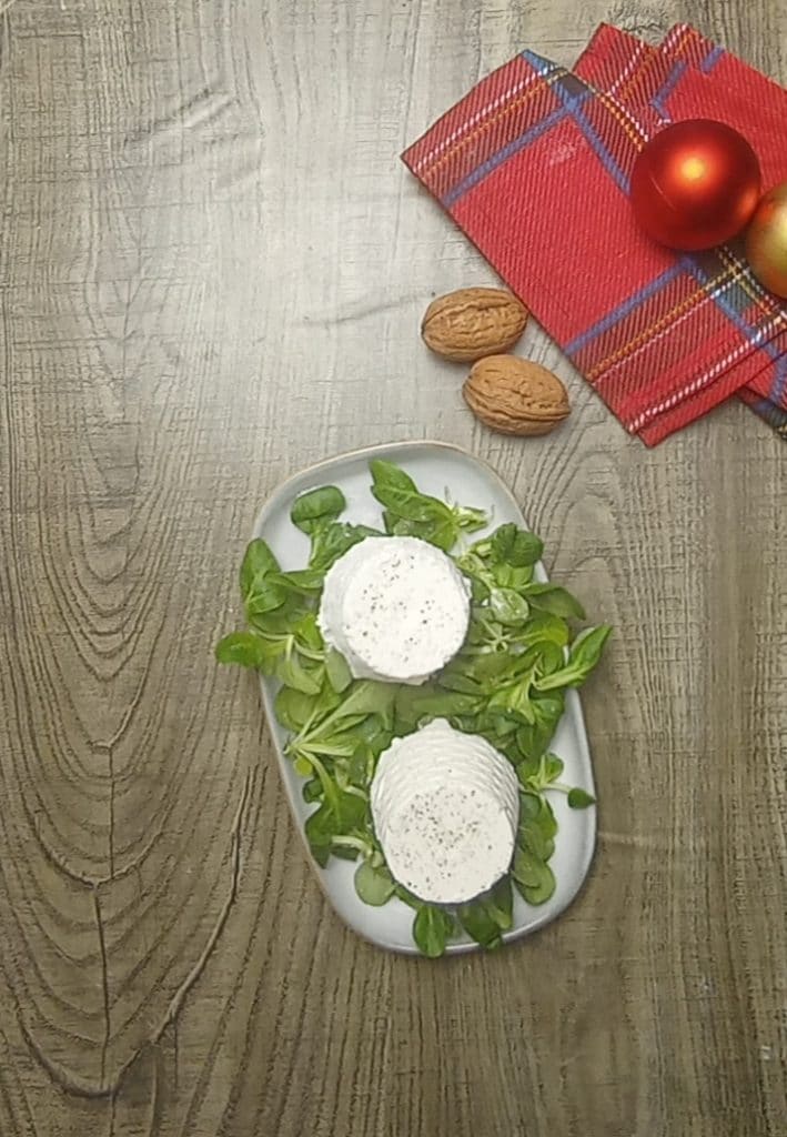 Garnieren Sie die Ricottine und die Basis aus Feldsalat mit ganzen oder grob gehackten Walnusskernen, und dekorieren Sie auch die Oberfläche des Käses.