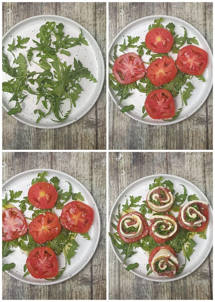 Ich empfehle, die Rolls in der gleichen Anzahl wie die Tomatenscheiben zu schneiden.