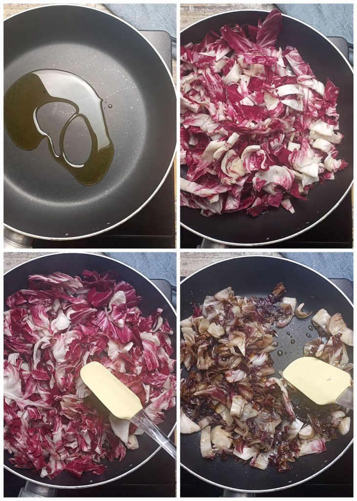 Den Radicchio in der Pfanne in zwei Esslöffeln Öl mit einer Prise Salz köcheln, bis er weich wird.