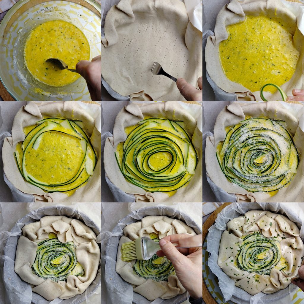 • Gut verrühren, bis eine homogene Masse entsteht. Mit einer Gabel den Boden des Blätterteigs einstechen, nachdem ihr ihn in die Form gelegt habt. Die Eimischung einfüllen und die Zucchinischeiben so anordnen, dass kleine Ringe entstehen. Den restlichen geriebenen Käse auf der Oberfläche verteilen und den Rand nach innen umklappen. Mit Sonnenblumenöl bestreichen und bei Bedarf leicht mit etwas gehackter Petersilie garnieren.