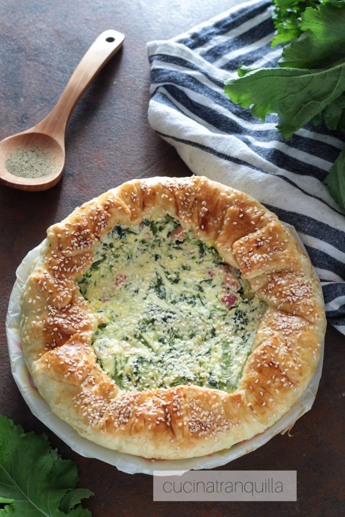 Rustikaler Kuchen mit Stängelkohl und Speck, ein Hauptgericht aus Blätterteig, das einfach und schnell zuzubereiten ist.