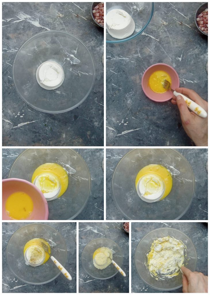 In der Zwischenzeit in einer Schüssel Ricotta mit geriebenem Käse, Salz, Pfeffer und einem Teil des Eies vermengen.