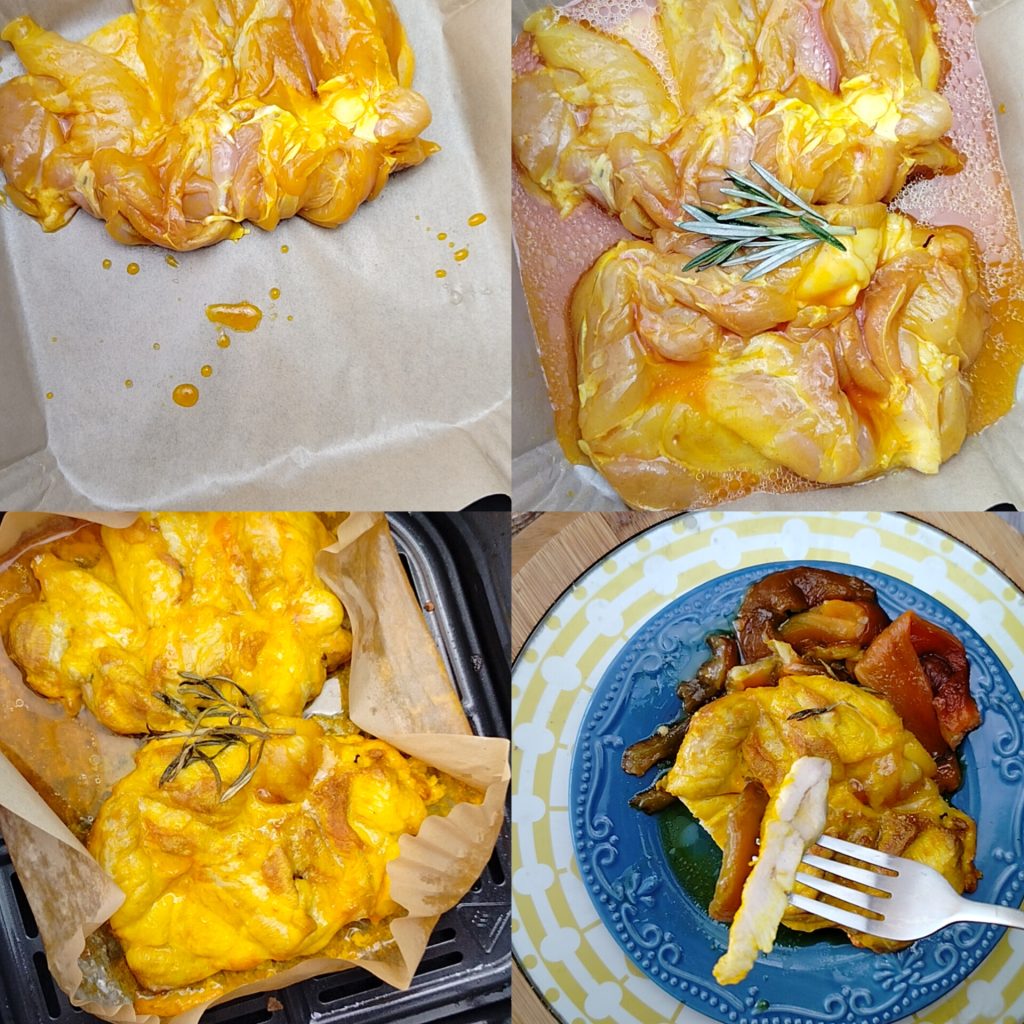 Nach dieser Zeit legen Sie das Heißluftfritteuse-Backpapier in den Frittierkorb und legen Sie das Fleisch hinein. Gießen Sie die Marinade-Flüssigkeit hinzu, falls gewünscht, fügen Sie einen Zweig Rosmarin hinzu und garen Sie bei 180° für 25 Minuten. Wenden Sie das Fleisch zur Hälfte der Garzeit.