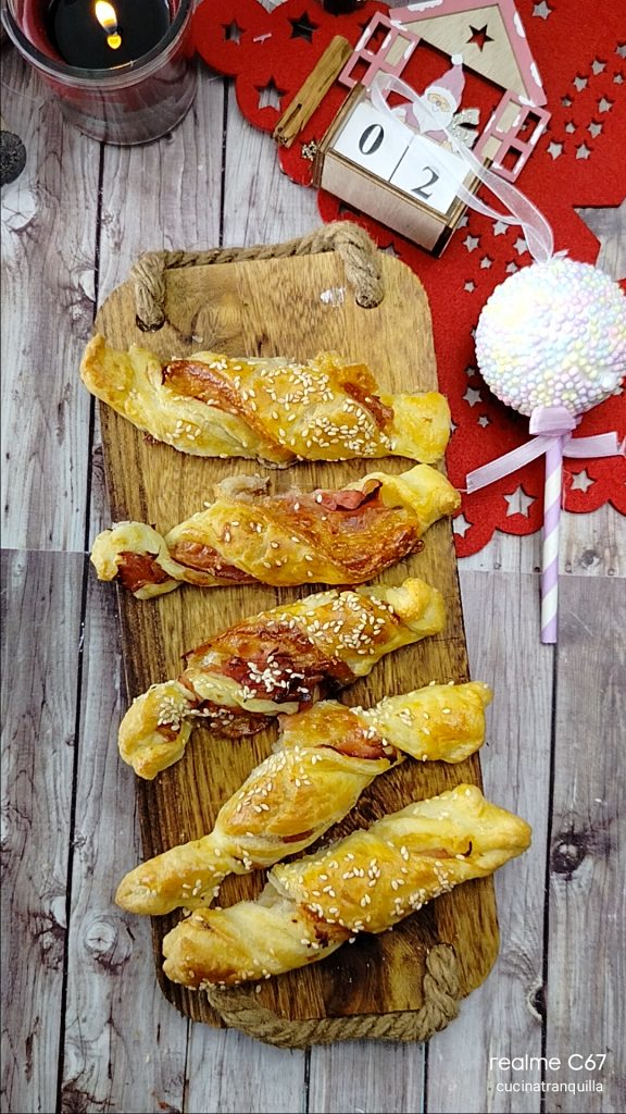 Salzige Zöpfe mit Scamorza und gekochtem Schinken Weihnachtsvorspeise einfach und lecker, ideal für diejenigen, die wenig Zeit in der Küche verbringen möchten. Auch mit Mürbeteig anstelle des klassischen Blätterteigs auszuprobieren. Diese Zöpfe sind sehr einfach herzustellen, können auch unterschiedlich dekoriert werden und im Blog finden Sie auch andere Versionen. Ideal, um sie als Brotstangen auf den Tisch zu bringen, sie werden hübsch in dekorierten Körben präsentiert. Sie brauchen nur sehr wenige Zutaten und Schritte, um es zu machen, es ist also wirklich sehr einfach. Unten lasse ich Ihnen weitere Rezepte, um Ihre Weihnachtsvorspeisen zu kreieren, während unten das vollständige Rezept mit fotografischen Schritten.