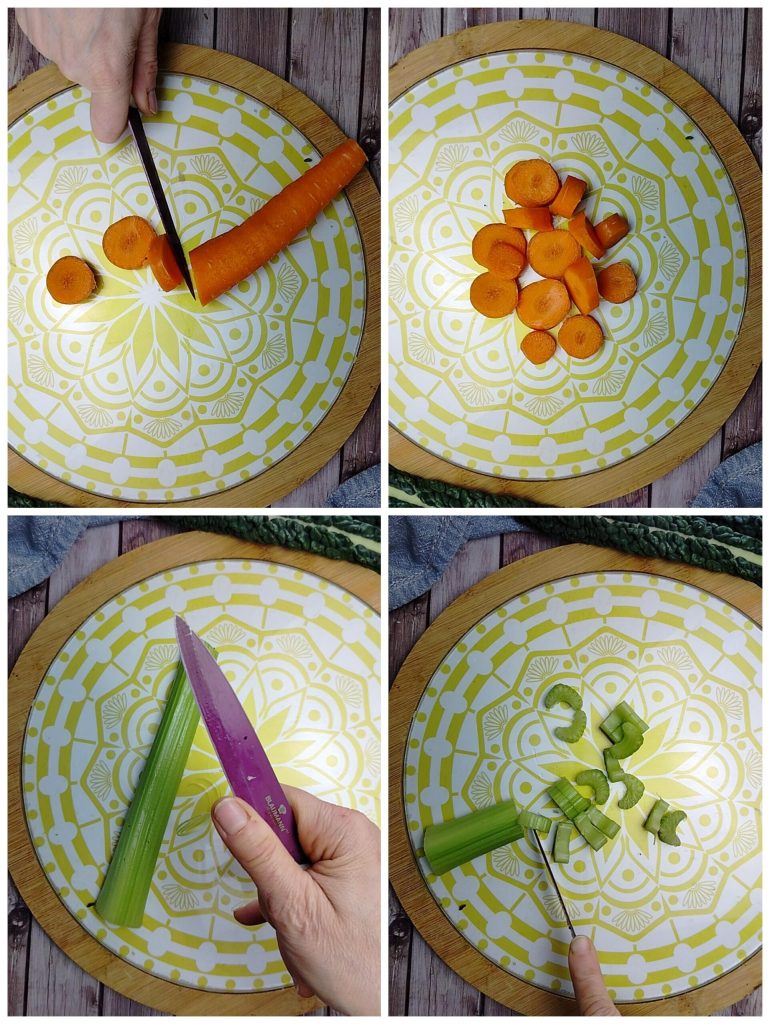 Wir entfernen die Enden des Selleries und die Fäden und schneiden ihn in Stücke.