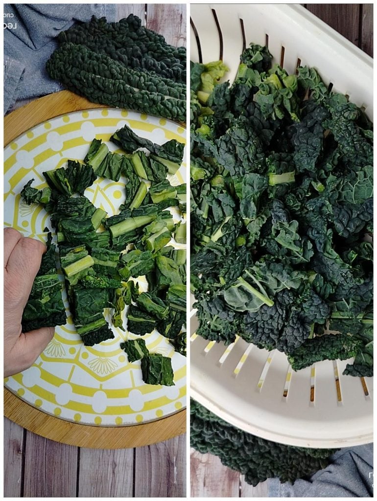 Um die Schwarzkohlsuppe mit Pioppini-Pilzen und Kichererbsen zuzubereiten, reinigen wir zuerst den Schwarzkohl gründlich.