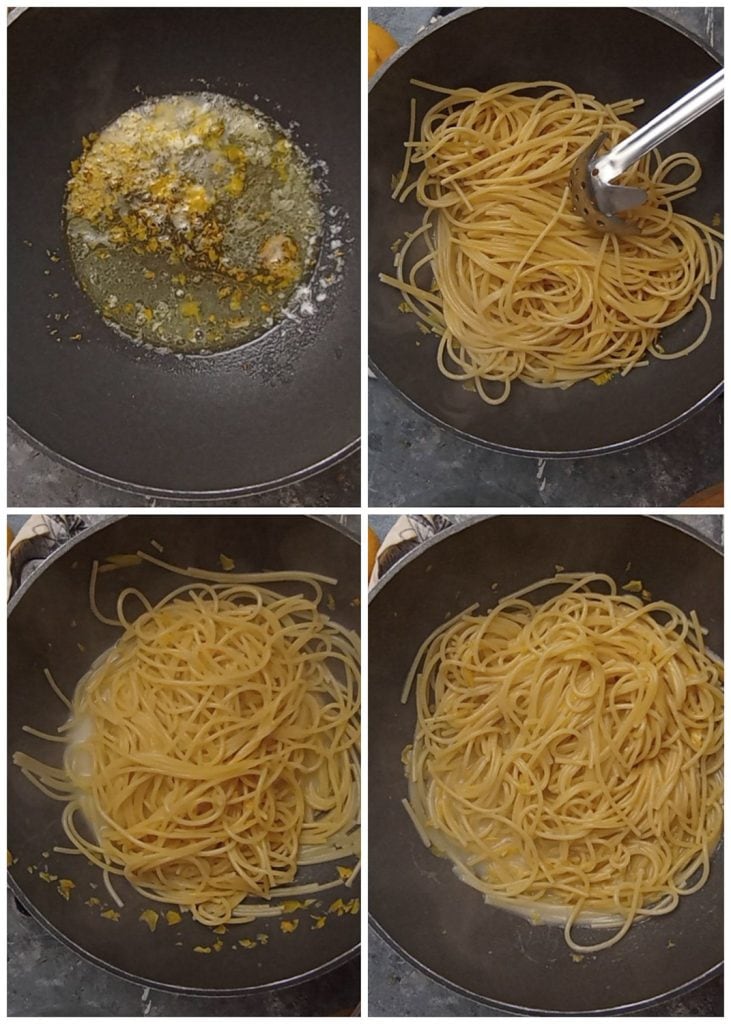In einem Wok die Butter schmelzen, die Zitronenschale und den Zitronensaft hinzufügen und die Spaghetti dazugeben.