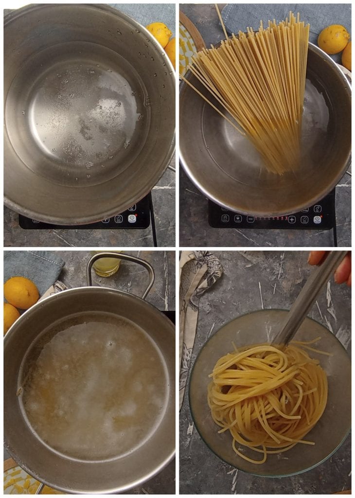 In der Zwischenzeit die Spaghetti in reichlich gesalzenem Wasser sehr al dente kochen, die empfohlene Zeit ist die Hälfte der auf der Verpackung angegebenen Zeit.