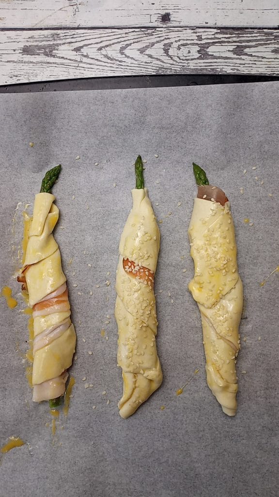 Wir wickeln den Spargel sehr gut ein, indem wir den Blätterteig und den Speck um seinen Stiel wickeln und die Spitze freilassen.
