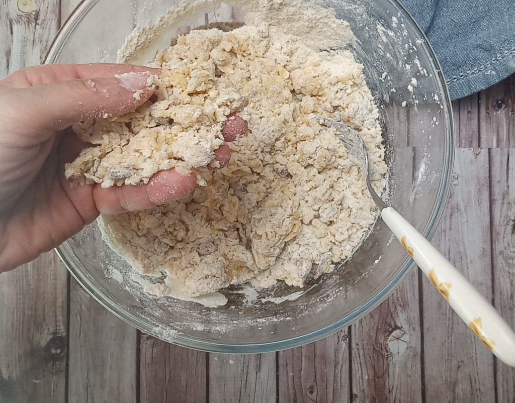 Wenn er nicht mehr klebrig ist und die trockenen Zutaten die gesamte Flüssigkeit aufgenommen haben, ist er bereit, um in der Form ausgerollt zu werden.