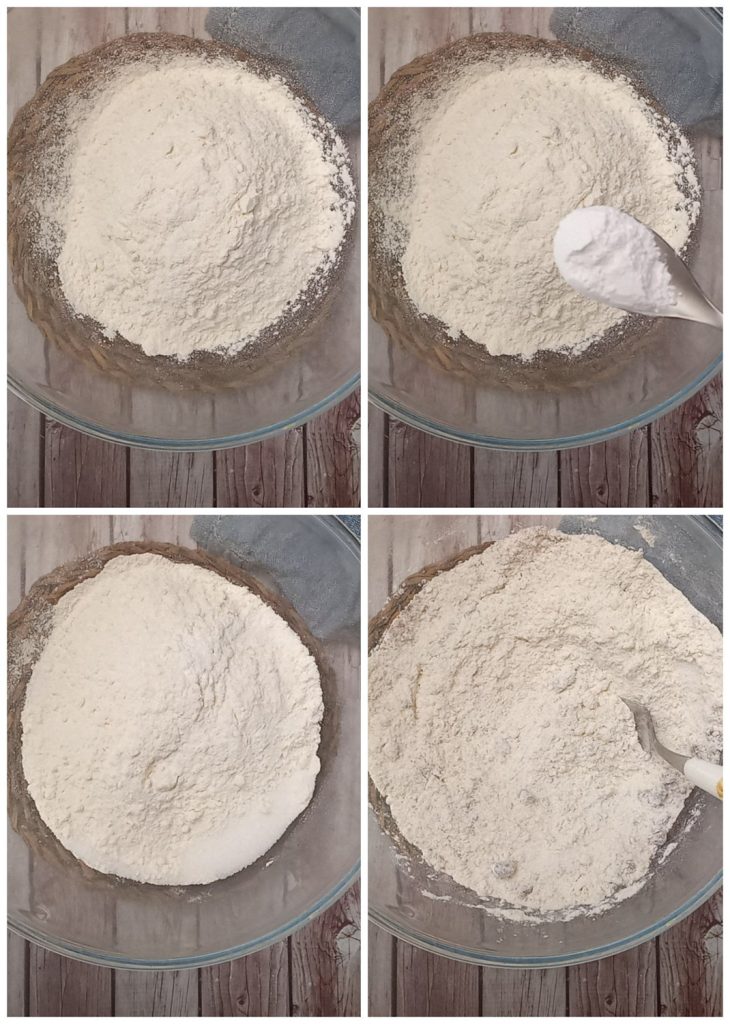 Beginne mit dem Mehl, füge das Backpulver und den Zucker hinzu und mische schnell mit einer Gabel.