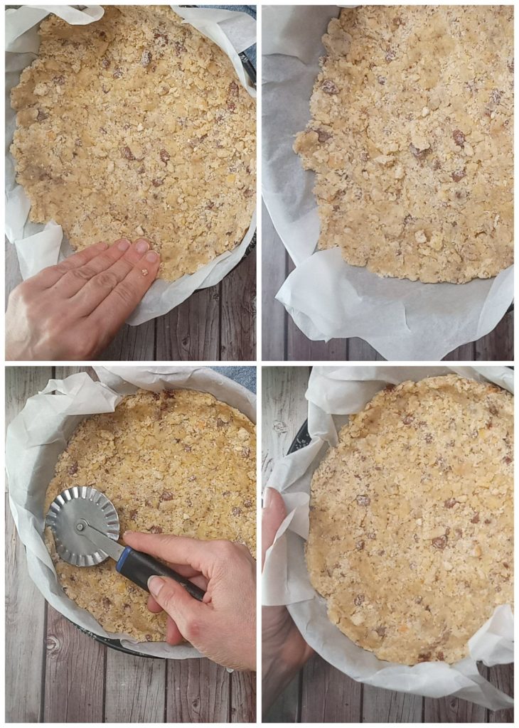 Mit der Hälfte des Teigs forme den Boden des Streuselkuchens, indem du ihn dann mit den Händen festdrückst.