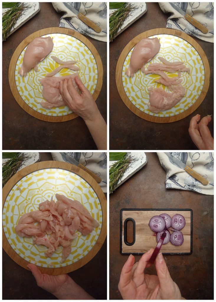 Für dieses Rezept habe ich mir überlegt, das Hähnchen mit der karamellisierten roten Zwiebel zu kochen, nachdem es in Streifen geschnitten wurde.