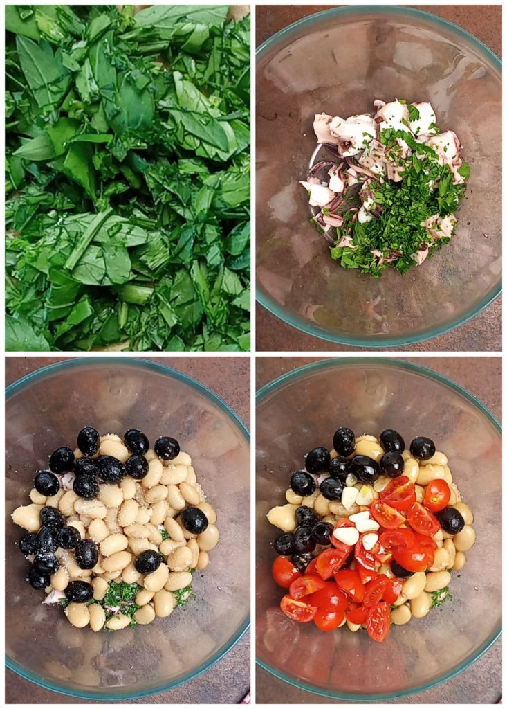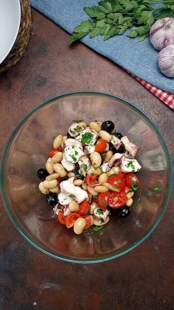 Tintenfisch- und Butterbohnen-Salat, ein frisches, schmackhaftes und nahrhaftes Gericht, das mit sehr wenigen Zutaten zubereitet wird und sich auch ideal für die Arbeit eignet.