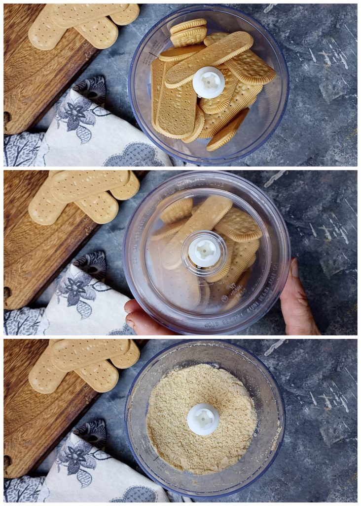 Wir geben die Kekse in den Mixer und zerkleinern sie, bis sie die Konsistenz von Sand haben.