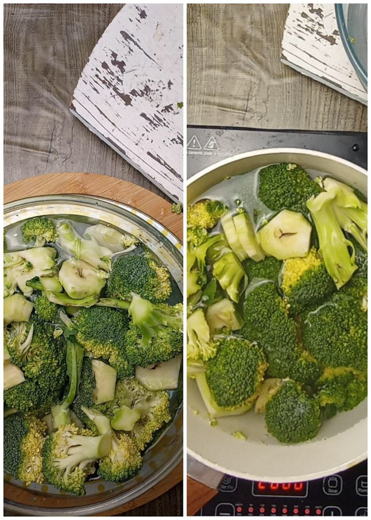 Schneiden Sie auch die Röschen ab, spülen Sie sie unter kaltem fließendem Wasser ab und blanchieren Sie sie in einem Topf mit reichlich gesalzenem Wasser.