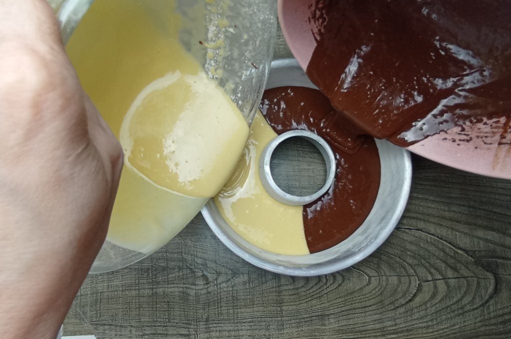 Eine 22 cm Kuchenform einfetten und mehlen und die beiden Teige gleichzeitig hineingießen.