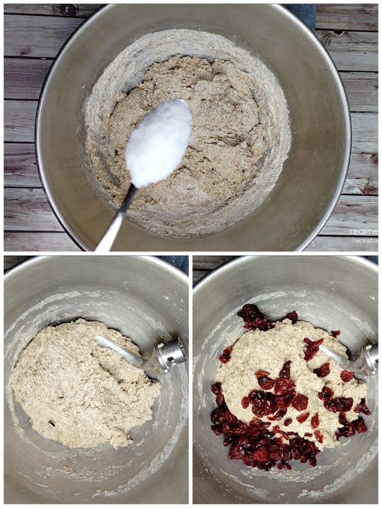 Sobald der Teig beginnt, sich zu verbinden, fügen Sie das Salz hinzu, kneten Sie erneut mit dem Knethaken und geben Sie dann die Cranberries dazu.