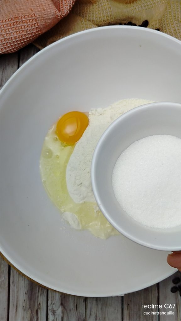 In einer großen Schüssel das Ei mit Mehl und Zucker vermengen.