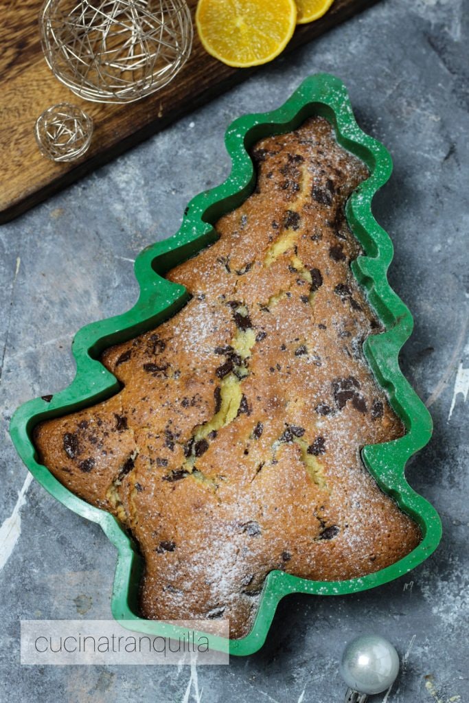 Weich und angereichert mit Zartbitterschokolade-Stücken kann der Weihnachtsbaum-Kuchen mit Orange auch mit kandierten Früchten oder Rosinen personalisiert werden und wird ebenso gut sein.