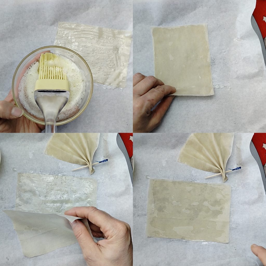 Um die Filoteigfächer zu machen, schneiden Sie zuerst die Filoteigblätter auf die Größe von 10 cm x 14 cm. Sie benötigen 18 Stück. Bestreichen Sie jedes Blatt mit Butter. Ich empfehle, jeweils ein Paar zu machen, um zu verhindern, dass die Butter das Blatt austrocknet. Legen Sie zwei Blätter übereinander.