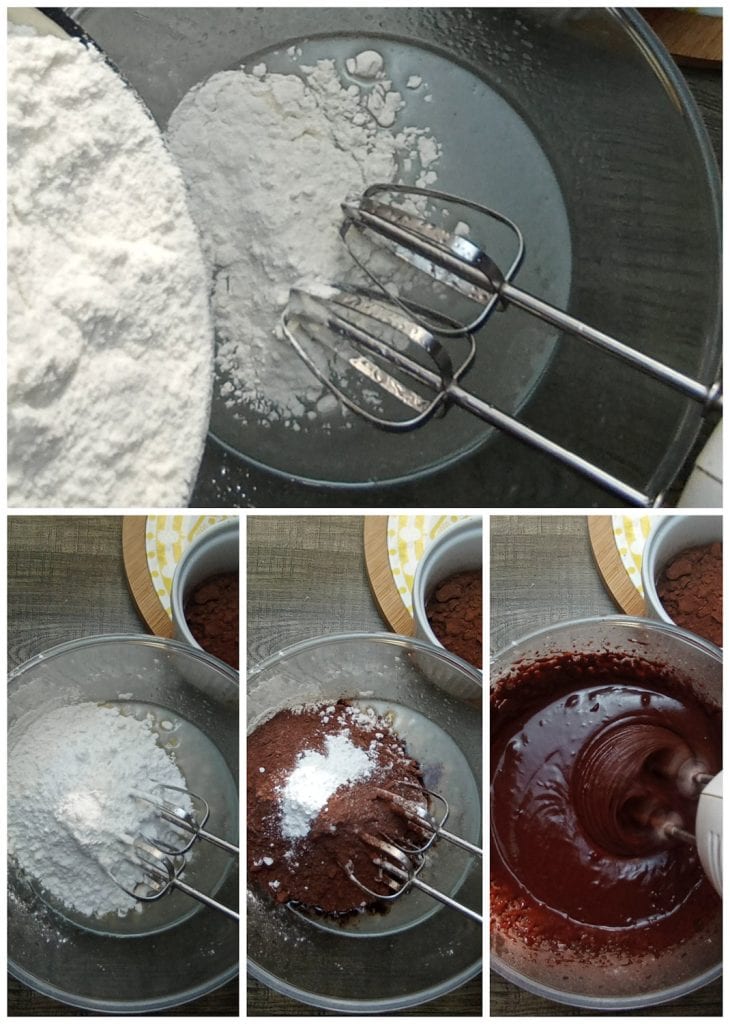 Fügen Sie das gesiebte Mehl mit der Kartoffelstärke, dem Kakao und dem Backpulver hinzu und rühren Sie die Zutaten mit dem elektrischen Schneebesen, bis eine glatte und homogene Masse entsteht.