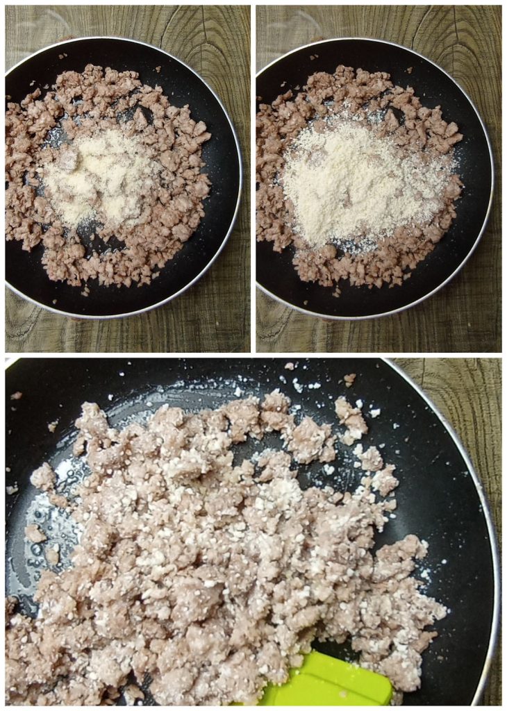 Nach etwa 10 Minuten schalten wir die Hitze ab und, nachdem die Wurst abgekühlt ist, fügen wir in derselben Pfanne den geriebenen Parmesan und den gesalzenen Ricotta hinzu. Kein Salz hinzufügen. Die Zutaten sind bereits würzig genug.