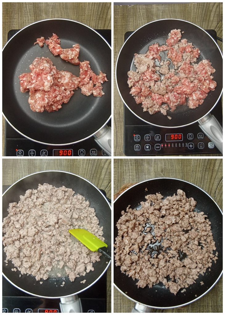 In der Zwischenzeit braten wir das Wurstbrät in einer großen Pfanne an und löschen es mit einem halben Glas Wein ab.