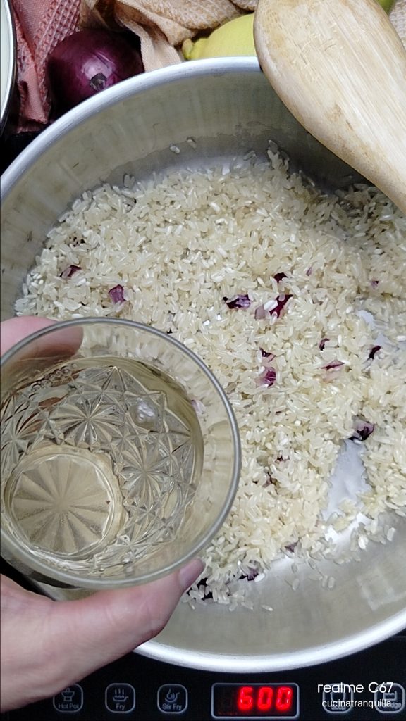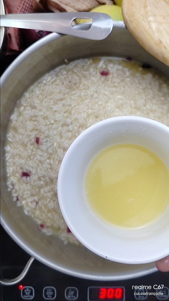 Wenn der Alkohol verdampft ist, fügen Sie nach und nach eine großzügige Kelle heiße Brühe hinzu, wobei Sie die nächste hinzufügen, wenn die vorherige absorbiert wurde. Dies, um zu vermeiden, dass der Reis verwässert wird.