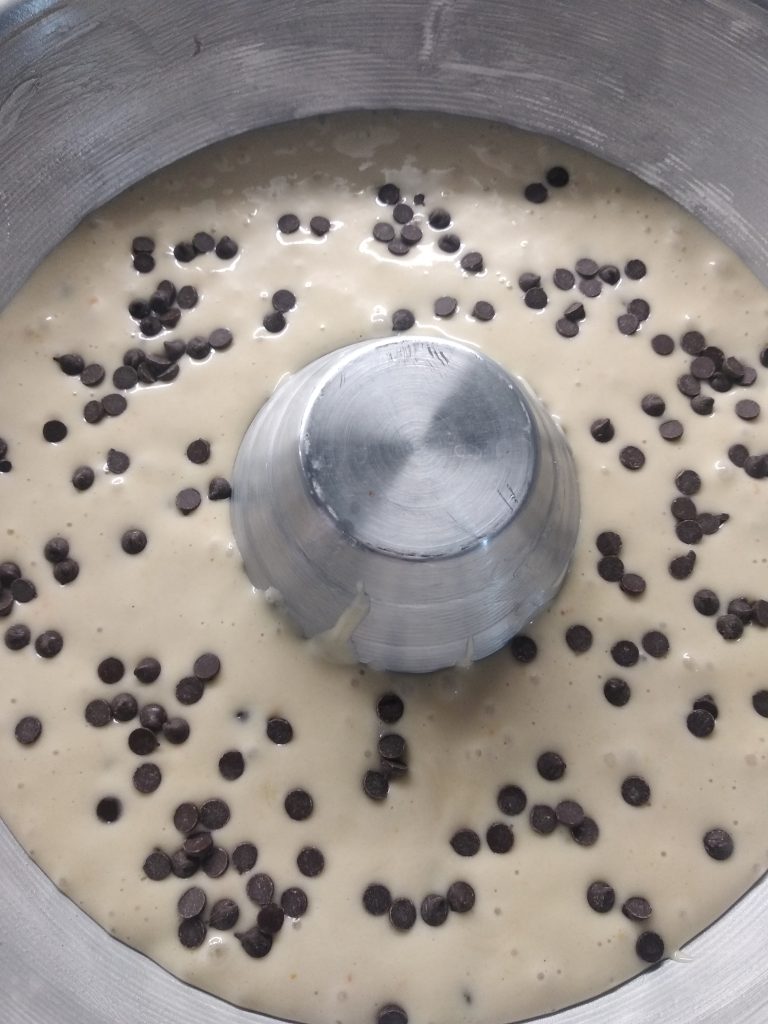 Der KRANZKOCHEN OHNE WAAGE UND MIT VIELEN SCHOKOLADENSTÜCKCHEN ist fertig.