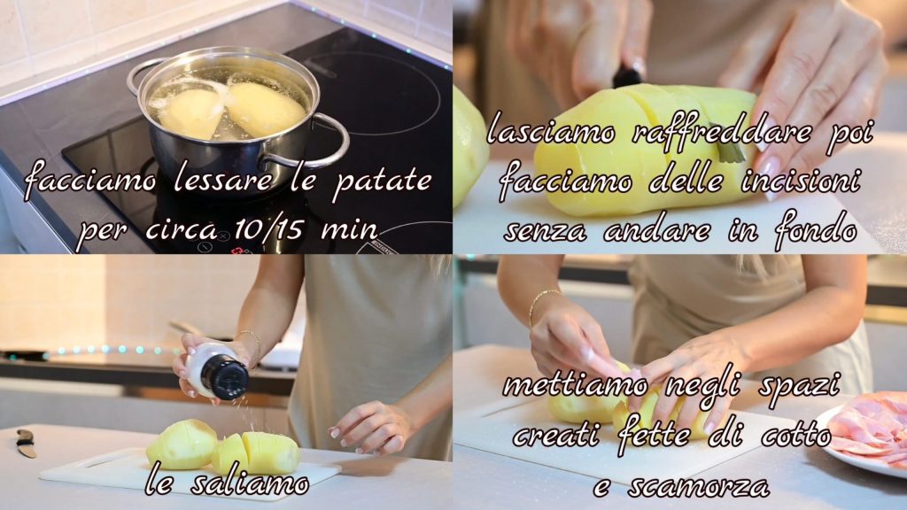 Zuerst reinigen, waschen und kochen wir die Kartoffeln für etwa 10/15 Min. Dann abgießen und gut abkühlen lassen, bevor man Einschnitte macht, ohne durchzuschneiden (siehe Video HIER). Salzen und in die entstandenen Zwischenräume Schinken- und Scamorza-Scheiben legen.